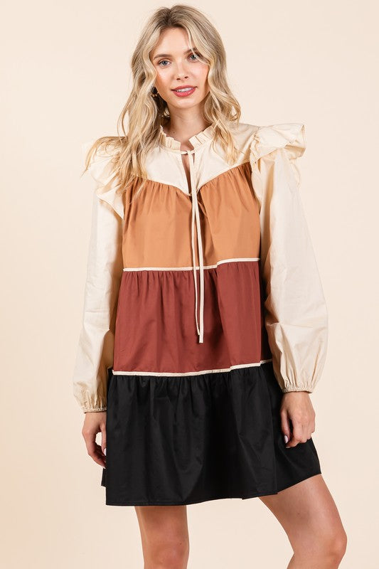 regular size, standard, contemporary, young contemporary, color block, poplin, woven, tiered, mini dress, short dress, casual dress, v-neck, ruffle trim, optional self-tie, long sleeve, elastic cuff, cute, trendy, comfortable, daily wear, minimalist, transitional, fall, winter, spring, summer, fw, ss, women's clothing, women's apparel, women's wear